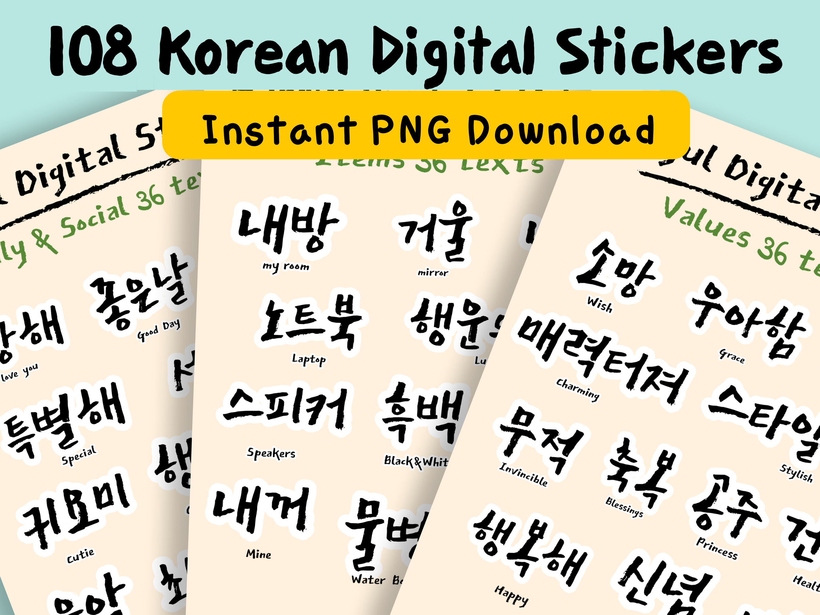 Korean Alphabet Hangul DIGITAL Stickers bundle - 108 different texts (all 3 sets) included.